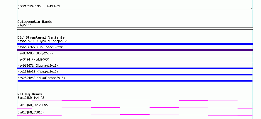 Variant DetailsVariant: nsv3366036 | Internal ID | 19797014 | | Landmark | | | Location Information | | | Cytoband | 21q22.11 | | Allele length | | Assembly | Allele length | | hg38 | 140 | | hg19 | 140 |