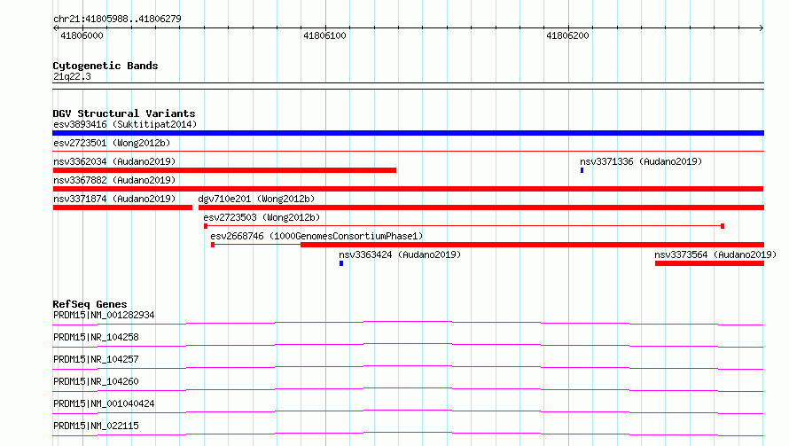Variant DetailsVariant: nsv3367882| Internal ID | 19452175 | | Landmark | | | Location Information | | | Cytoband | 21q22.3 | | Allele length | | Assembly | Allele length | | hg38 | 292 | | hg19 | 292 |