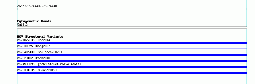 Variant DetailsVariant: nsv3381235| Internal ID | 19812214 | | Landmark | | | Location Information | | | Cytoband | 5q13.3 | | Allele length | | Assembly | Allele length | | hg38 | 293 | | hg19 | 293 |