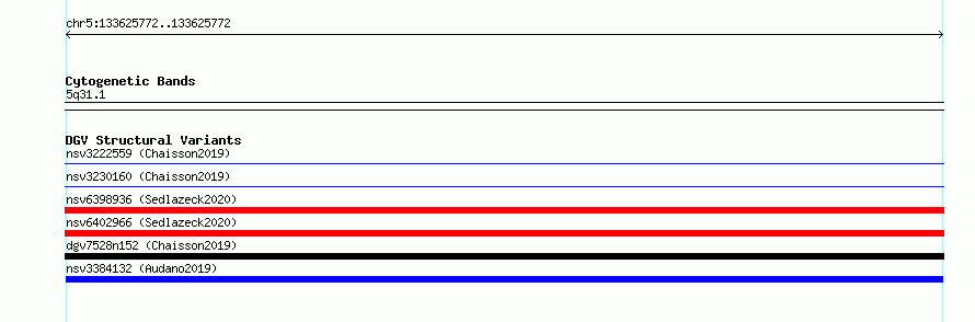 Variant DetailsVariant: nsv3384132| Internal ID | 19815111 | | Landmark | | | Location Information | | | Cytoband | 5q31.1 | | Allele length | | Assembly | Allele length | | hg38 | 116 | | hg19 | 116 |