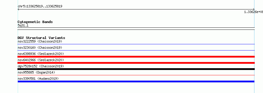 Variant DetailsVariant: nsv3390581| Internal ID | 19821558 | | Landmark | | | Location Information | | | Cytoband | 5q31.1 | | Allele length | | Assembly | Allele length | | hg38 | 85 | | hg19 | 85 |