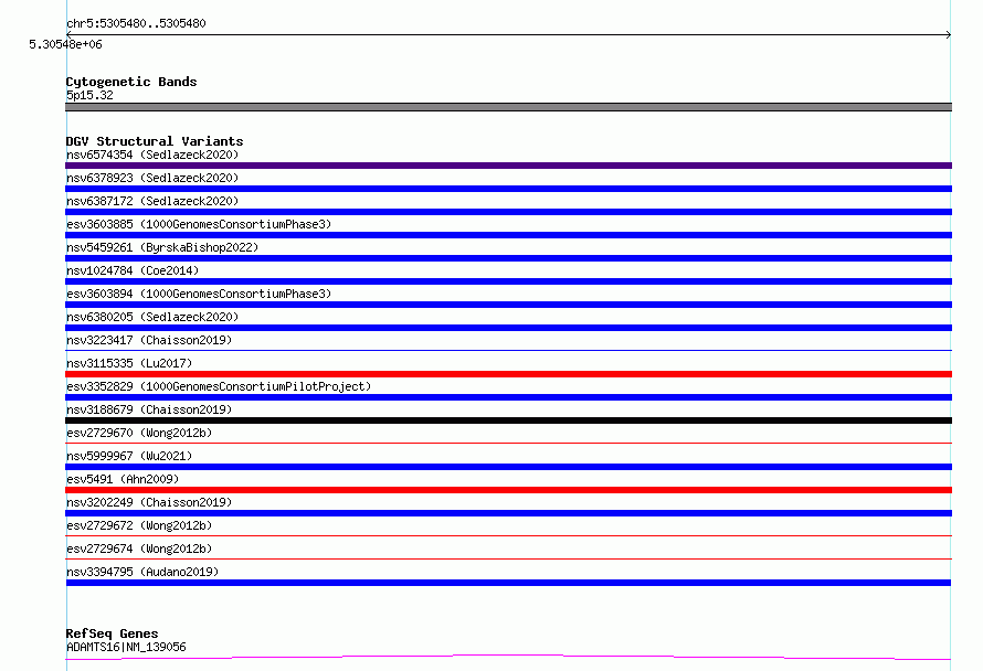 Variant DetailsVariant: nsv3394795| Internal ID | 19825772 | | Landmark | | | Location Information | | | Cytoband | 5p15.32 | | Allele length | | Assembly | Allele length | | hg38 | 254 | | hg19 | 254 |