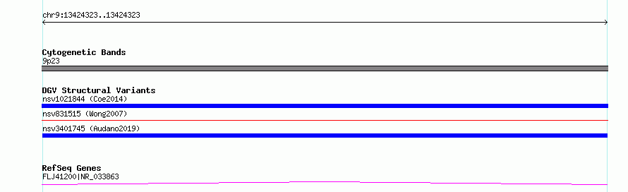 Variant DetailsVariant: nsv3401745Internal ID | 19486035 | Landmark | | Location Information | | Cytoband | 9p23 | Allele length | Assembly | Allele length | hg38 | 1413 | hg19 | 1413 |