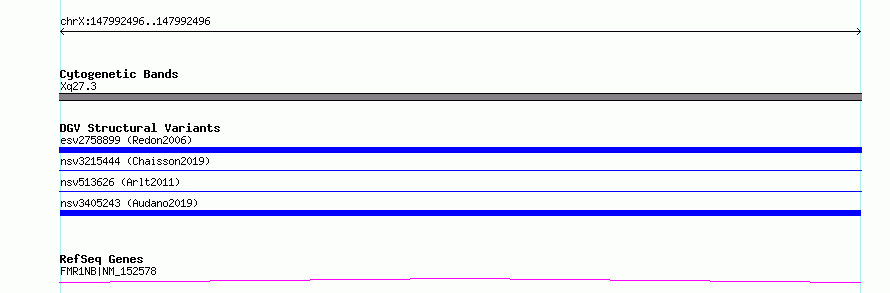 Variant DetailsVariant: nsv3405243 | Internal ID | 19836219 | | Landmark | | | Location Information | | | Cytoband | Xq27.3 | | Allele length | | Assembly | Allele length | | hg38 | 127 | | hg19 | 127 |