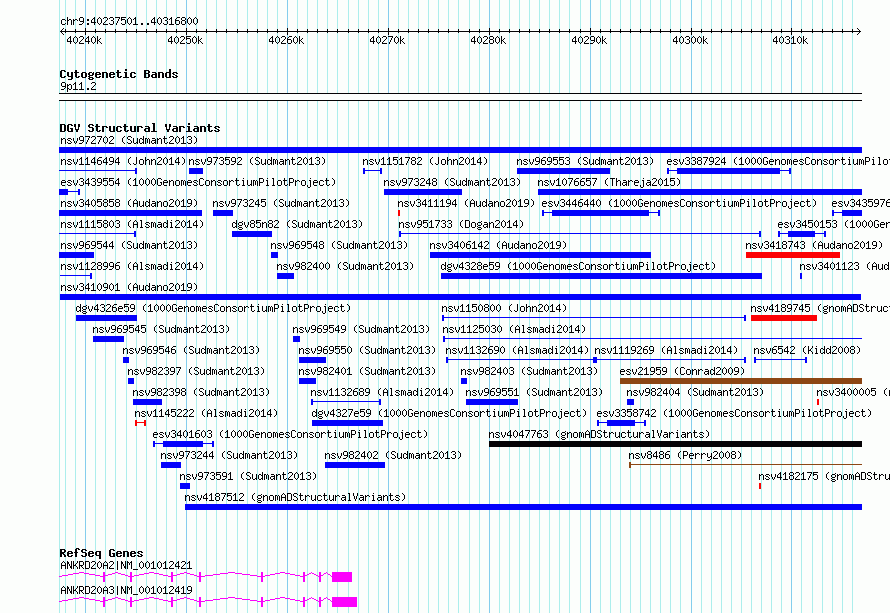 | Variant Type | CNV duplication | Copy Number | | Allele State | | Allele Origin | | Probe Count | | Validation Flag | | Merged Status | M | Merged Variants | | Supporting Variants | nssv14783056, nssv14787595, nssv14778630, nssv14778183, nssv14789977, nssv14785646, nssv14787608, nssv14777534, nssv14787084, nssv14789483, nssv14786551, nssv14780388, nssv14787618 | Samples | CHM13, HG02106, HG04217, CHM1, HG00268, NA12878, HG02818, HG02059, HG01352, NA19434, NA19240, HG00733, HG00514 | Known Genes | ANKRD20A2, ANKRD20A3 | Method | Sequencing | Analysis | Read and contig alignments were done with BLASR. The Celera assembler (8.3rc2) was used to assemble RS II samples (CHM1, CHM13, HG00514, HG00733, NA19240, HG02818, NA19434, HG01352, HG02059, NA12878, and HG04217, and Canu (1.7) was used for Sequel samples (HG02106 and HG00268). Variant calling was performed with SMRT-SV (10.1101/gr.214007.116). | Platform | PacBio RS II P6C4, PacBio Sequel v2.1 | Comments | | Reference | Audano_et_al_2019 | Pubmed ID | 30661756 | Accession Number(s) | nsv3410901