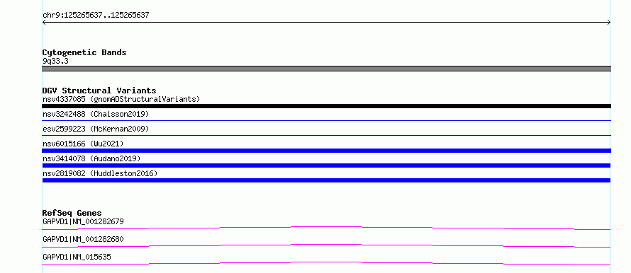 Variant DetailsVariant: nsv3414078 | Internal ID | 19845055 | | Landmark | | | Location Information | | | Cytoband | 9q33.3 | | Allele length | | Assembly | Allele length | | hg38 | 838 | | hg19 | 838 |