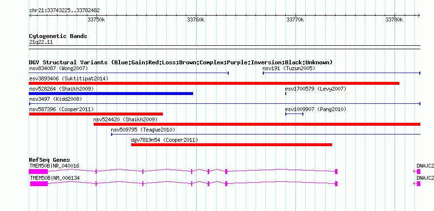 Variant DetailsVariant: nsv3497| Internal ID | 15548112 | | Landmark | | | Location Information | | | Cytoband | 21q22.11 | | Allele length | | Assembly | Allele length | | hg38 | 8915 | | hg19 | 8915 | | hg18 | 8915 | | hg17 | 8915 |