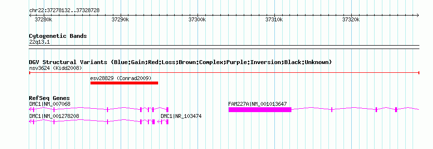 | | Variant Type | CNV deletion | | Copy Number | | | Allele State | | | Allele Origin | | | Probe Count | | | Validation Flag | | | Merged Status | M | | Merged Variants | | | Supporting Variants | nssv2373, nssv7747 | | Samples | NA12156, NA18555 | | Known Genes | DMC1, FAM227A | | Method | Sequencing | | Analysis | End-sequence pairs were mapped to the human genome assembly (hg17) using a previously described algorithm (Tuzun et al 2005) | | Platform | Capillary | | Comments | | | Reference | Kidd_et_al_2008 | | Pubmed ID | 18451855 | | Accession Number(s) | nsv3624
