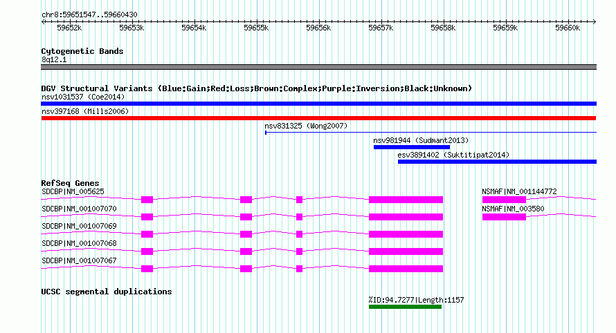 Variant DetailsVariant: nsv397168 | Internal ID | 16853374 | | Landmark | | | Location Information | | | Cytoband | 8q12.1 | | Allele length | | Assembly | Allele length | | hg38 | 8884 | | hg19 | 8884 | | hg18 | 8884 | | hg17 | 8884 |