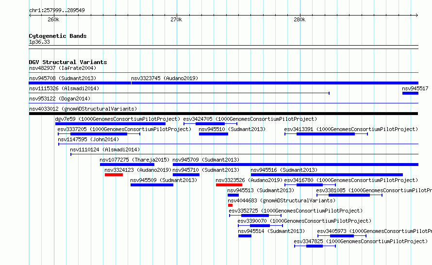 Variant DetailsVariant: nsv4033012 | Internal ID | 19817213 | | Landmark | | | Location Information | | | Cytoband | 1p36.33 | | Allele length | | Assembly | Allele length | | hg38 | 31551 | | hg19 | 31551 |