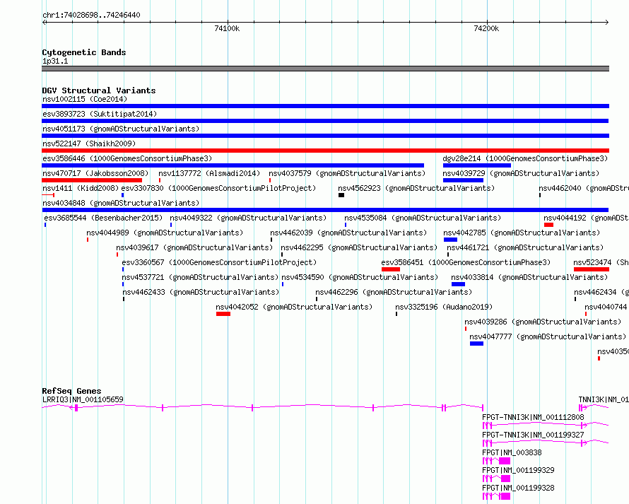 Variant DetailsVariant: nsv4034848 Internal ID | 19818524 | Landmark | | Location Information | | Cytoband | 1p31.1 | Allele length | Assembly | Allele length | hg38 | 217743 | hg19 | 217743 |