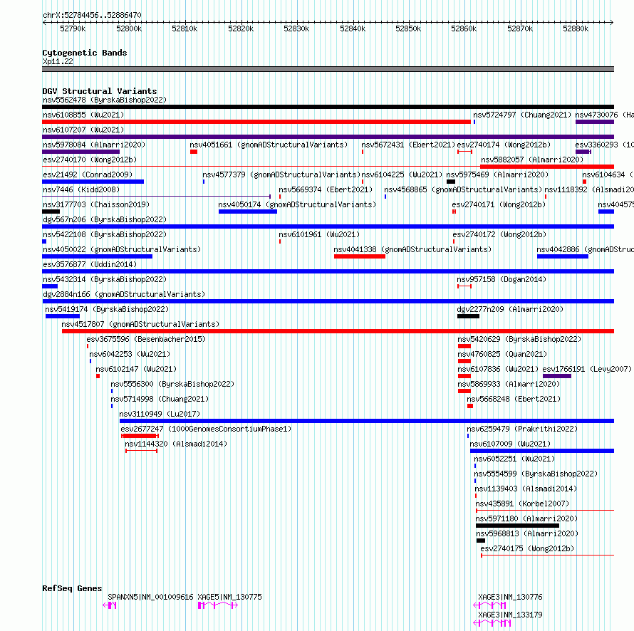 Variant DetailsVariant: nsv4035757 | Internal ID | 20165843 | | Landmark | | | Location Information | | | Cytoband | Xp11.22 | | Allele length | | Assembly | Allele length | | hg38 | 102015 | | hg19 | 102001 |