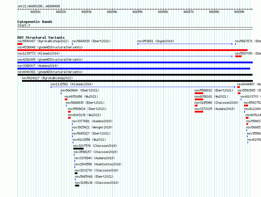 Variant DetailsVariant: nsv4040392 | Internal ID | 20169051 | | Landmark | | | Location Information | | | Cytoband | 21q22.3 | | Allele length | | Assembly | Allele length | | hg38 | 9201 | | hg19 | 9201 |