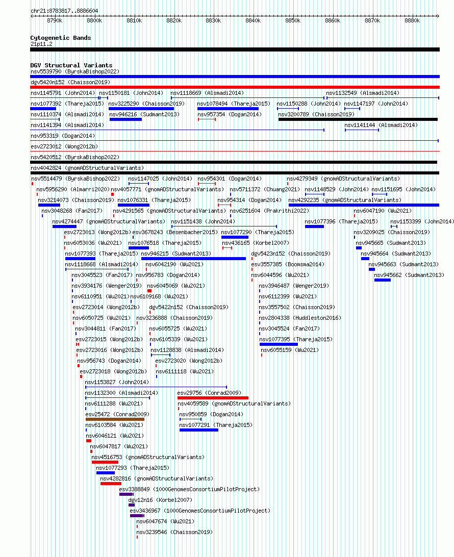 Variant DetailsVariant: nsv4042824 | Internal ID | 20170741 | | Landmark | | | Location Information | | | Cytoband | 21p11.2 | | Allele length | | Assembly | Allele length | | hg38 | 102788 | | hg19 | 102788 |