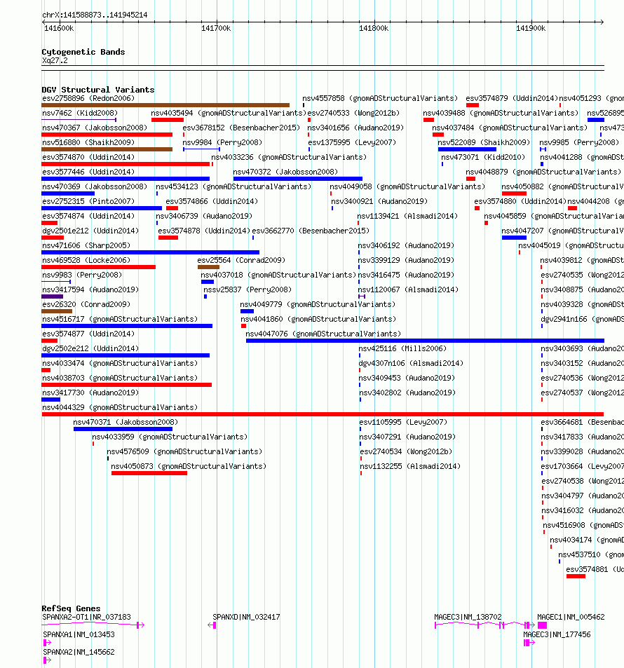 | Variant Type | CNV deletion | Copy Number | | Allele State | | Allele Origin | | Probe Count | | Validation Flag | | Merged Status | M | Merged Variants | | Supporting Variants | nssv15948519 | Samples | | Known Genes | MAGEC1, MAGEC3, SPANXA1, SPANXA2, SPANXA2-OT1, SPANXD, SPANXE | Method | Sequencing | Analysis | SV calls were generated using multi-algorithm consensus pipeline involving raw evidence assessment, filtering, clustering, genotyping, alternative allele structure resolution, and gene annotation. These methods are described in detail in the gnomAD-SV preprint [Collins*, Brand*, et al., bioRxiv (2019)|https://www.biorxiv.org/content/10.1101/578674v1], and are largely based on methods developed in [Werling et al., Nat. Genet. (2018)|https://www.ncbi.nlm.nih.gov/pubmed/29700473]. | Platform | | Comments | | Reference | gnomAD_Structural_Variants | Pubmed ID | 12345678 | Accession Number(s) | nsv4044329