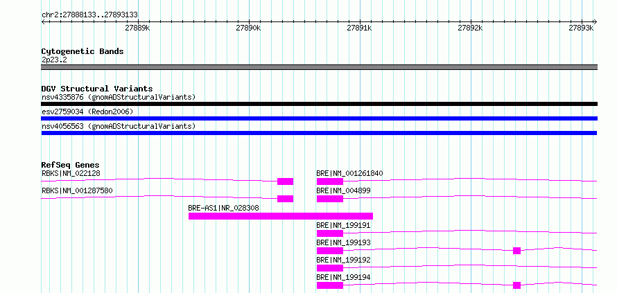 | Variant Type | CNV duplication | Copy Number | | Allele State | | Allele Origin | | Probe Count | | Validation Flag | | Merged Status | M | Merged Variants | | Supporting Variants | nssv15967837 | Samples | | Known Genes | BRE, BRE-AS1, RBKS | Method | Sequencing | Analysis | SV calls were generated using multi-algorithm consensus pipeline involving raw evidence assessment, filtering, clustering, genotyping, alternative allele structure resolution, and gene annotation. These methods are described in detail in the gnomAD-SV preprint [Collins*, Brand*, et al., bioRxiv (2019)|https://www.biorxiv.org/content/10.1101/578674v1], and are largely based on methods developed in [Werling et al., Nat. Genet. (2018)|https://www.ncbi.nlm.nih.gov/pubmed/29700473]. | Platform | | Comments | | Reference | gnomAD_Structural_Variants | Pubmed ID | 12345678 | Accession Number(s) | nsv4056563