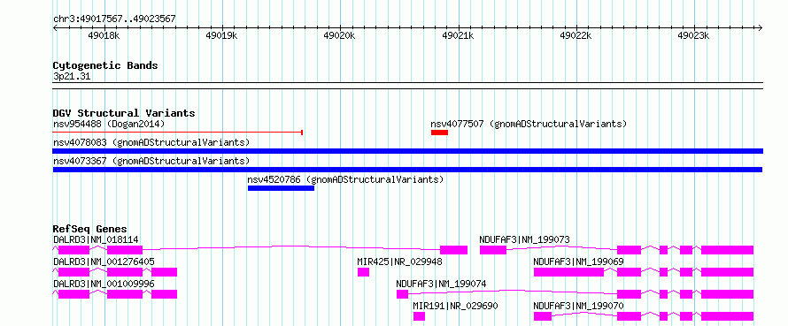 | Variant Type | CNV duplication | Copy Number | | Allele State | | Allele Origin | | Probe Count | | Validation Flag | | Merged Status | M | Merged Variants | | Supporting Variants | nssv15972388 | Samples | | Known Genes | DALRD3, MIR191, MIR425, NDUFAF3 | Method | Sequencing | Analysis | SV calls were generated using multi-algorithm consensus pipeline involving raw evidence assessment, filtering, clustering, genotyping, alternative allele structure resolution, and gene annotation. These methods are described in detail in the gnomAD-SV preprint [Collins*, Brand*, et al., bioRxiv (2019)|https://www.biorxiv.org/content/10.1101/578674v1], and are largely based on methods developed in [Werling et al., Nat. Genet. (2018)|https://www.ncbi.nlm.nih.gov/pubmed/29700473]. | Platform | | Comments | | Reference | gnomAD_Structural_Variants | Pubmed ID | 12345678 | Accession Number(s) | nsv4073367