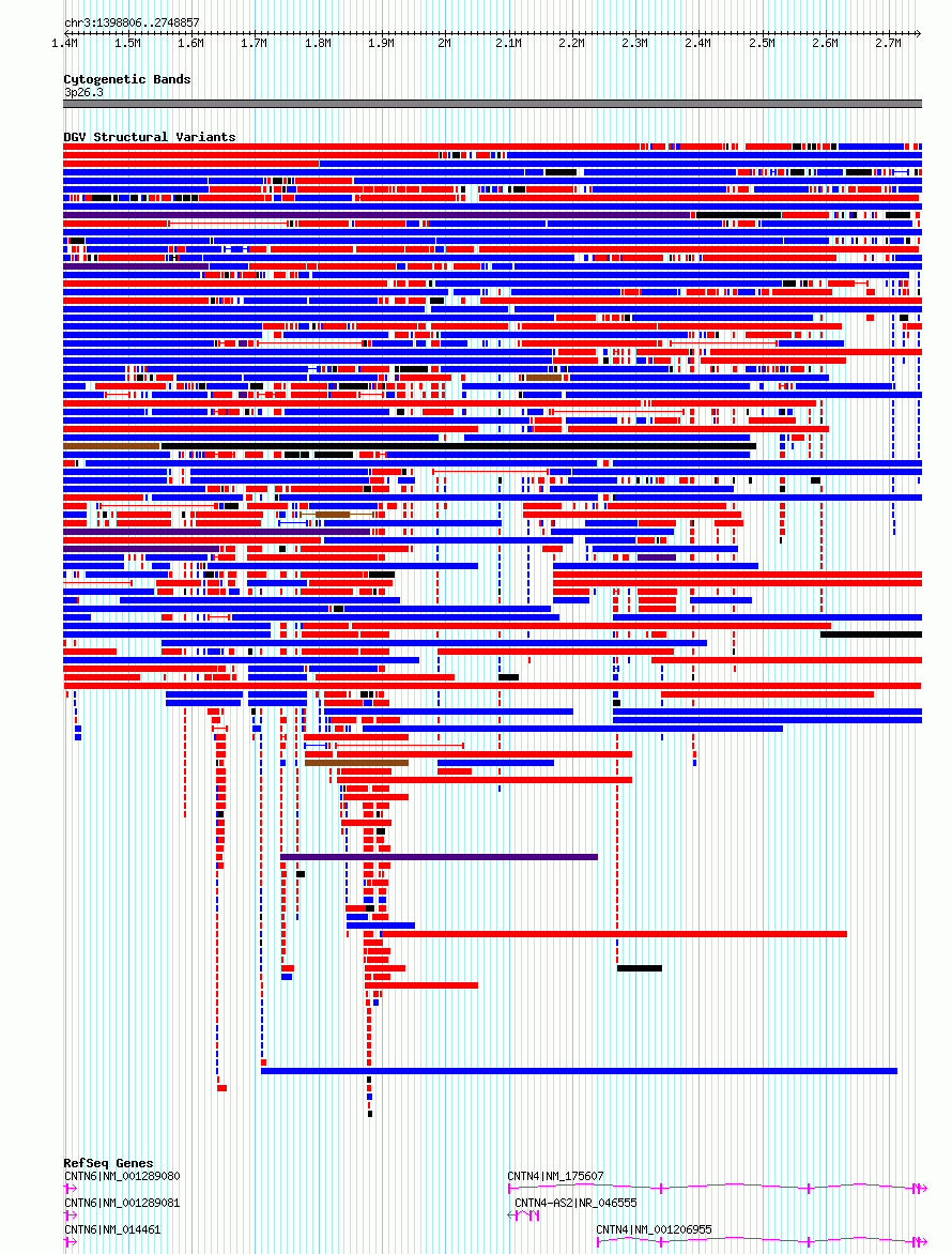 | | Variant Type | CNV deletion | | Copy Number | | | Allele State | | | Allele Origin | | | Probe Count | | | Validation Flag | | | Merged Status | M | | Merged Variants | | | Supporting Variants | nssv15877182 | | Samples | | | Known Genes | CNTN4, CNTN4-AS2, CNTN6 | | Method | Sequencing | | Analysis | SV calls were generated using multi-algorithm consensus pipeline involving raw evidence assessment, filtering, clustering, genotyping, alternative allele structure resolution, and gene annotation. These methods are described in detail in the gnomAD-SV preprint [Collins*, Brand*, et al., bioRxiv (2019)|https://www.biorxiv.org/content/10.1101/578674v1], and are largely based on methods developed in [Werling et al., Nat. Genet. (2018)|https://www.ncbi.nlm.nih.gov/pubmed/29700473]. | | Platform | | | Comments | | | Reference | gnomAD_Structural_Variants | | Pubmed ID | 32461652 | | Accession Number(s) | nsv4075106