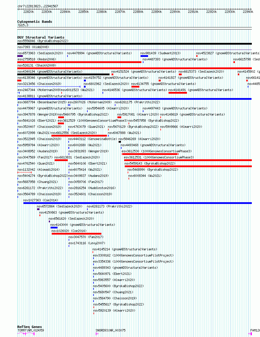 Variant DetailsVariant: nsv4138811 | Internal ID | 20364971 | | Landmark | | | Location Information | | | Cytoband | 7p15.3 | | Allele length | | Assembly | Allele length | | hg38 | 127745 | | hg19 | 127745 |
