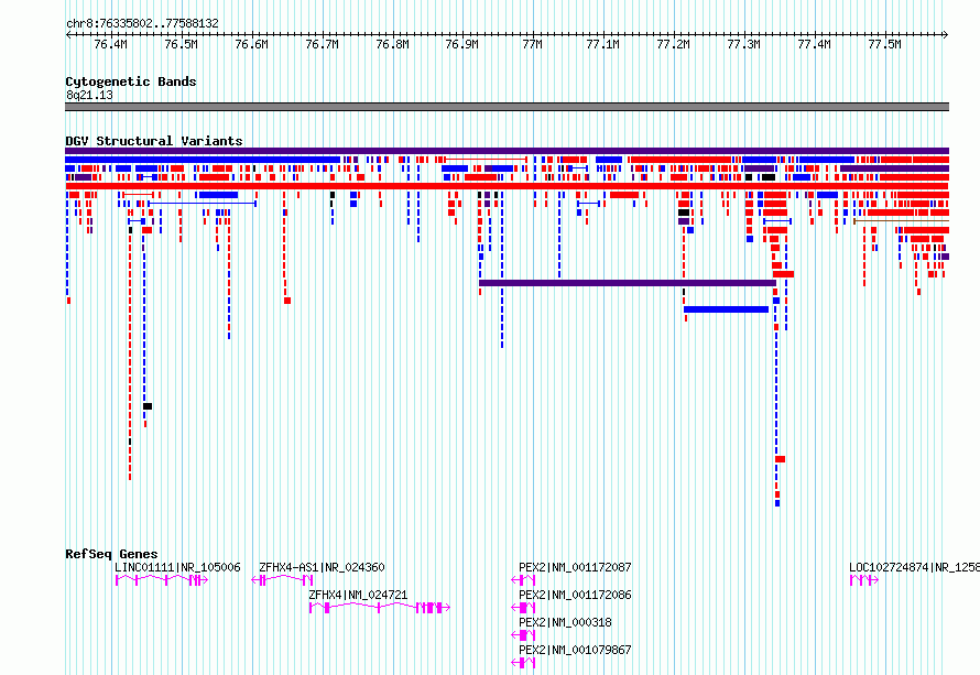 | | Variant Type | CNV deletion | | Copy Number | | | Allele State | | | Allele Origin | | | Probe Count | | | Validation Flag | | | Merged Status | M | | Merged Variants | | | Supporting Variants | nssv15931840 | | Samples | | | Known Genes | LINC01111, PEX2, ZFHX4, ZFHX4-AS1 | | Method | Sequencing | | Analysis | SV calls were generated using multi-algorithm consensus pipeline involving raw evidence assessment, filtering, clustering, genotyping, alternative allele structure resolution, and gene annotation. These methods are described in detail in the gnomAD-SV preprint [Collins*, Brand*, et al., bioRxiv (2019)|https://www.biorxiv.org/content/10.1101/578674v1], and are largely based on methods developed in [Werling et al., Nat. Genet. (2018)|https://www.ncbi.nlm.nih.gov/pubmed/29700473]. | | Platform | | | Comments | | | Reference | gnomAD_Structural_Variants | | Pubmed ID | 32461652 | | Accession Number(s) | nsv4169695