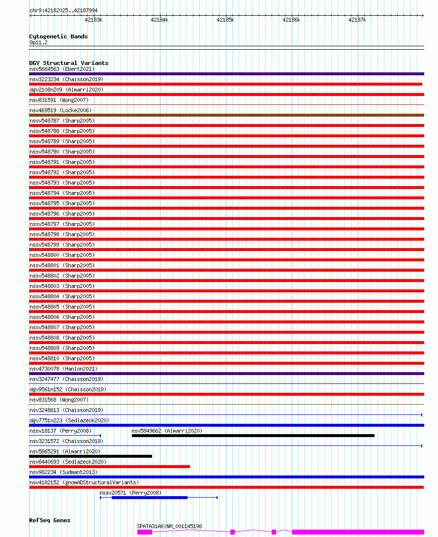 Variant DetailsVariant: nsv4182152 | Internal ID | 20396311 | | Landmark | | | Location Information | | | Cytoband | 9p12 | | Allele length | | Assembly | Allele length | | hg38 | 5970 | | hg19 | 6001 |