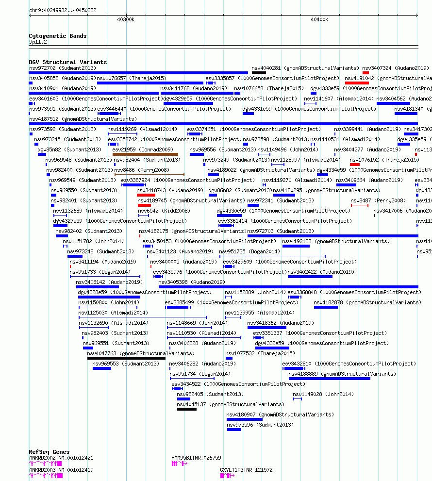 Variant DetailsVariant: nsv4187512 Internal ID | 20053414 | Landmark | | Location Information | | Cytoband | 9p12 | Allele length | Assembly | Allele length | hg38 | 200351 | hg19 | 200351 |