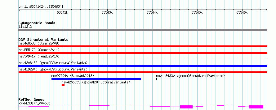 | Variant Type | CNV deletion | Copy Number | | Allele State | | Allele Origin | | Probe Count | | Validation Flag | | Merged Status | M | Merged Variants | | Supporting Variants | nssv15803598 | Samples | | Known Genes | MIR3680-1, MIR3680-2, RARRES3 | Method | Sequencing | Analysis | SV calls were generated using multi-algorithm consensus pipeline involving raw evidence assessment, filtering, clustering, genotyping, alternative allele structure resolution, and gene annotation. These methods are described in detail in the gnomAD-SV preprint [Collins*, Brand*, et al., bioRxiv (2019)|https://www.biorxiv.org/content/10.1101/578674v1], and are largely based on methods developed in [Werling et al., Nat. Genet. (2018)|https://www.ncbi.nlm.nih.gov/pubmed/29700473]. | Platform | | Comments | | Reference | gnomAD_Structural_Variants | Pubmed ID | 12345678 | Accession Number(s) | nsv4192940