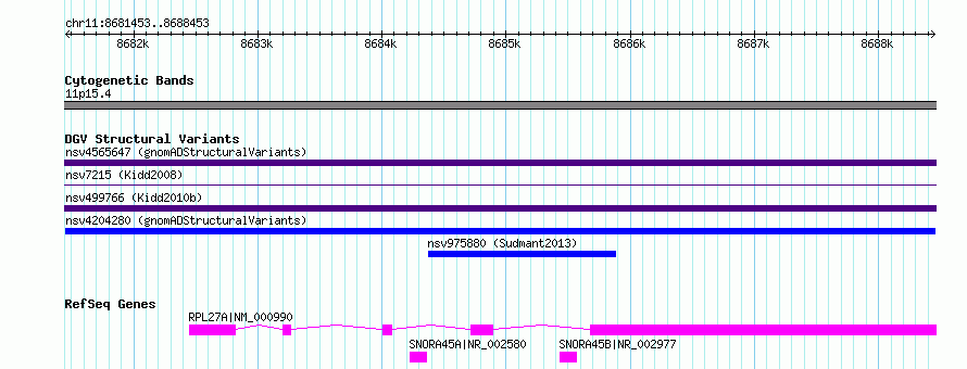Variant DetailsVariant: nsv4204280 | Internal ID | 20065565 | | Landmark | | | Location Information | | | Cytoband | 11p15.4 | | Allele length | | Assembly | Allele length | | hg38 | 7001 | | hg19 | 7001 |