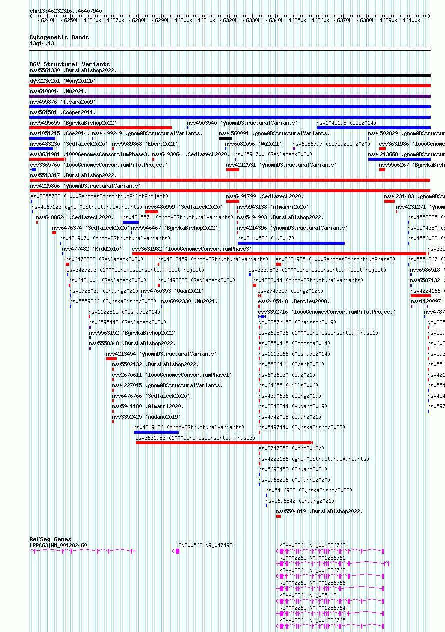 Variant DetailsVariant: nsv4225806 | Internal ID | 20427656 | | Landmark | | | Location Information | | | Cytoband | 13q14.13 | | Allele length | | Assembly | Allele length | | hg38 | 175625 | | hg19 | 175625 |