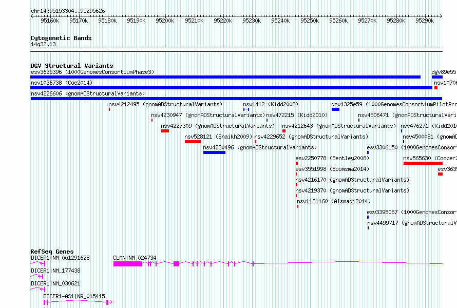 | | Variant Type | CNV duplication | | Copy Number | | | Allele State | | | Allele Origin | | | Probe Count | | | Validation Flag | | | Merged Status | M | | Merged Variants | | | Supporting Variants | nssv15952648 | | Samples | | | Known Genes | CLMN, DICER1, DICER1-AS1 | | Method | Sequencing | | Analysis | SV calls were generated using multi-algorithm consensus pipeline involving raw evidence assessment, filtering, clustering, genotyping, alternative allele structure resolution, and gene annotation. These methods are described in detail in the gnomAD-SV preprint [Collins*, Brand*, et al., bioRxiv (2019)|https://www.biorxiv.org/content/10.1101/578674v1], and are largely based on methods developed in [Werling et al., Nat. Genet. (2018)|https://www.ncbi.nlm.nih.gov/pubmed/29700473]. | | Platform | | | Comments | | | Reference | gnomAD_Structural_Variants | | Pubmed ID | 12345678 | | Accession Number(s) | nsv4226606