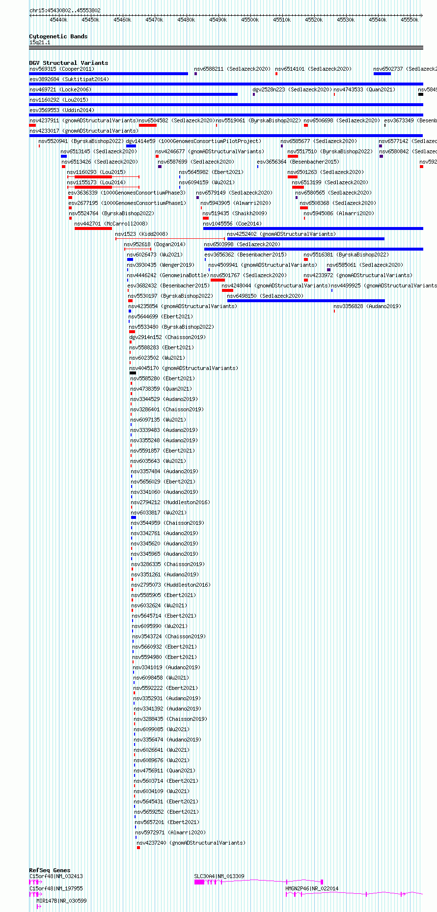 Variant DetailsVariant: nsv4233017 | Internal ID | 20432810 | | Landmark | | | Location Information | | | Cytoband | 15q21.1 | | Allele length | | Assembly | Allele length | | hg38 | 123001 | | hg19 | 123001 |