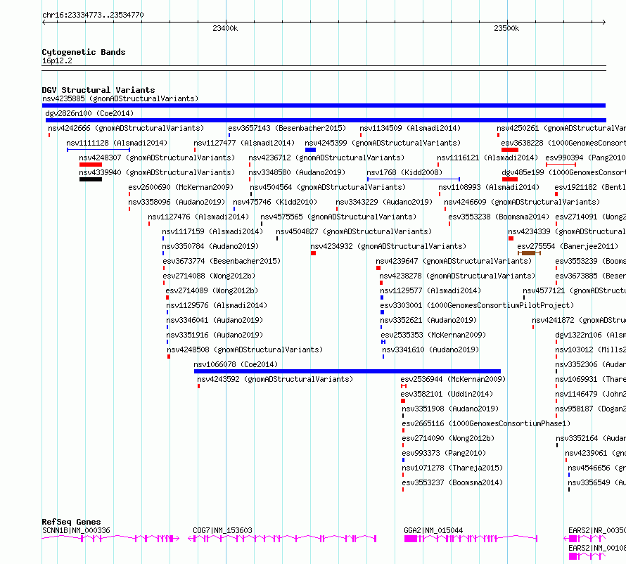 Variant DetailsVariant: nsv4235885 Internal ID | 20088029 | Landmark | | Location Information | | Cytoband | 16p12.2 | Allele length | Assembly | Allele length | hg38 | 199998 | hg19 | 199998 |