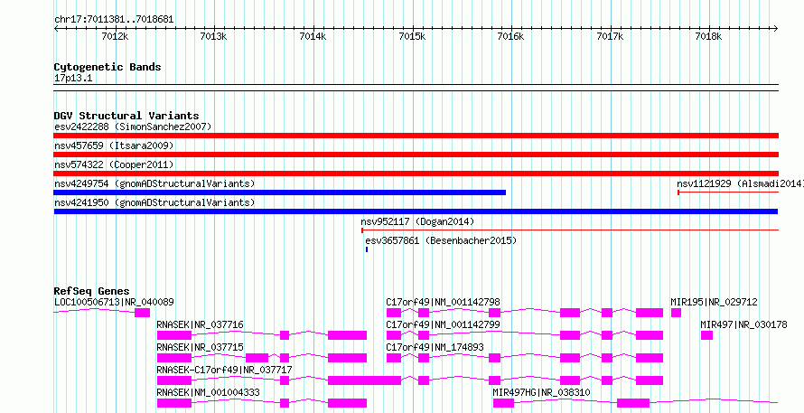 Variant DetailsVariant: nsv4241950 Internal ID | 20092108 | Landmark | | Location Information | | Cytoband | 17p13.1 | Allele length | Assembly | Allele length | hg38 | 7301 | hg19 | 7301 |
