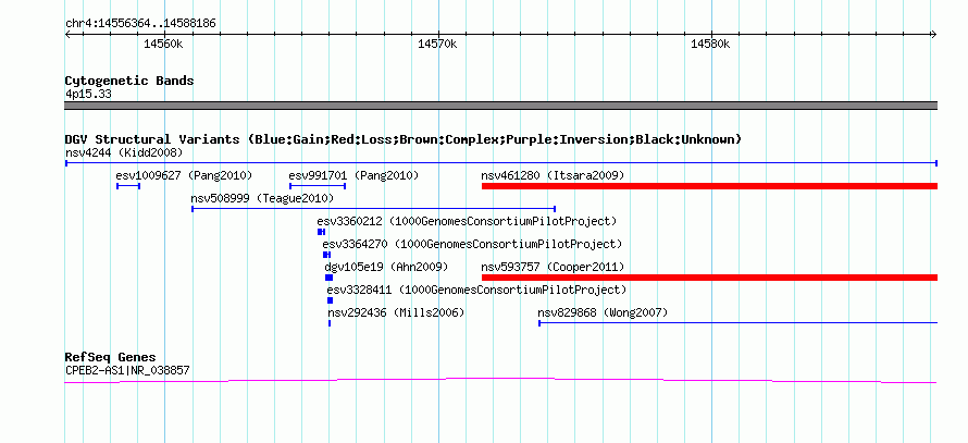 Variant DetailsVariant: nsv4244| Internal ID | 15548934 | | Landmark | | | Location Information | | | Cytoband | 4p15.33 | | Allele length | | Assembly | Allele length | | hg38 | 7452 | | hg19 | 7452 | | hg18 | 7452 | | hg17 | 7452 |