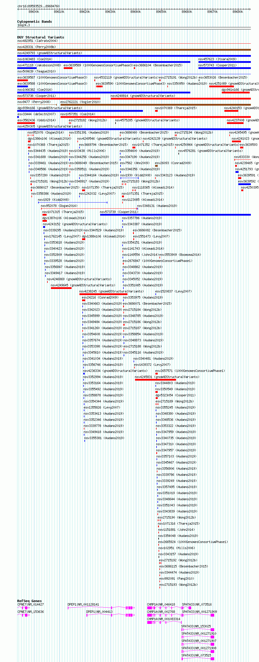 Variant DetailsVariant: nsv4250305 Internal ID | 20097693 | Landmark | | Location Information | | Cytoband | 16q24.3 | Allele length | Assembly | Allele length | hg38 | 91232 | hg19 | 91232 |