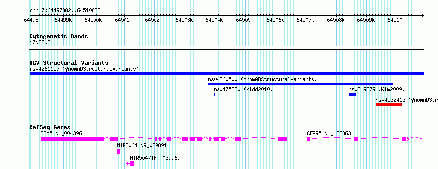 | Variant Type | CNV duplication | Copy Number | | Allele State | | Allele Origin | | Probe Count | | Validation Flag | | Merged Status | M | Merged Variants | | Supporting Variants | nssv15959645 | Samples | | Known Genes | CEP95, DDX5, MIR3064, MIR5047 | Method | Sequencing | Analysis | SV calls were generated using multi-algorithm consensus pipeline involving raw evidence assessment, filtering, clustering, genotyping, alternative allele structure resolution, and gene annotation. These methods are described in detail in the gnomAD-SV preprint [Collins*, Brand*, et al., bioRxiv (2019)|https://www.biorxiv.org/content/10.1101/578674v1], and are largely based on methods developed in [Werling et al., Nat. Genet. (2018)|https://www.ncbi.nlm.nih.gov/pubmed/29700473]. | Platform | | Comments | | Reference | gnomAD_Structural_Variants | Pubmed ID | 12345678 | Accession Number(s) | nsv4261157
