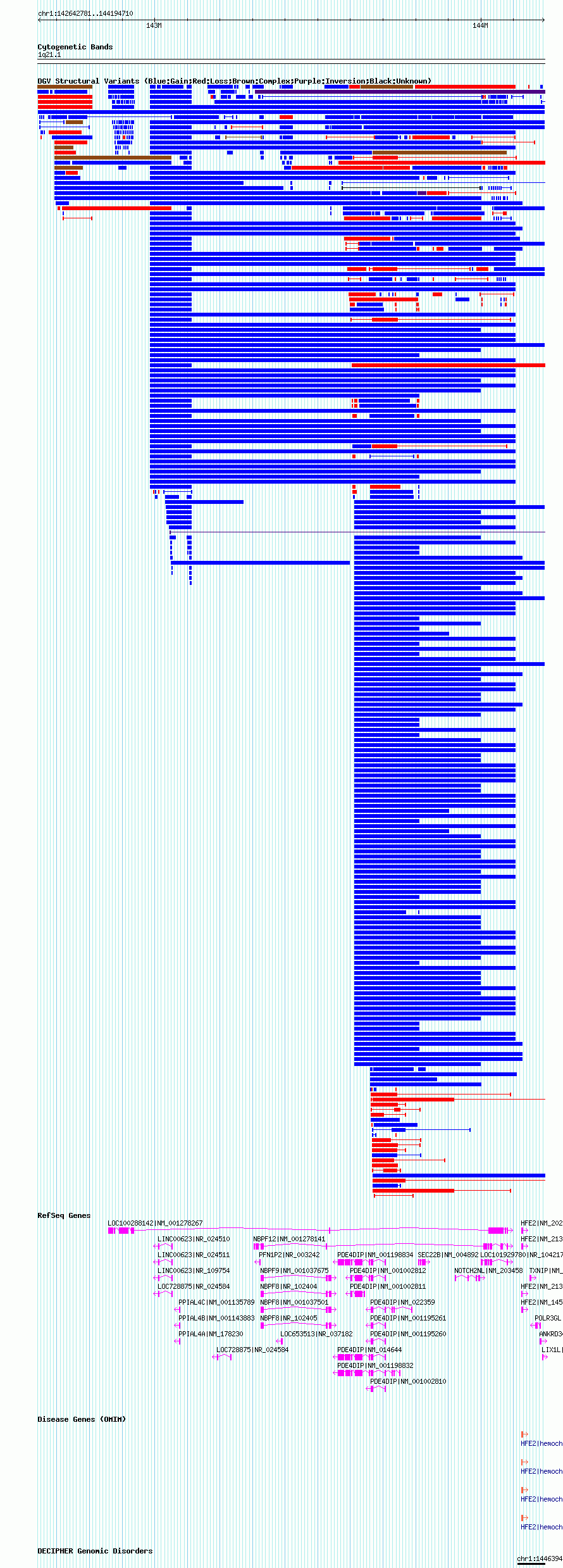 | | Variant Type | CNV gain | | Copy Number | | | Allele State | | | Allele Origin | | | Probe Count | | | Validation Flag | | | Merged Status | M | | Merged Variants | | | Supporting Variants | nssv451219, nssv451298, nssv451230, nssv451186, nssv451309, nssv451208, nssv451331, nssv451243, nssv451175, nssv451164, nssv451197, nssv451287, nssv451265, nssv451254 | | Samples | HGDP00462, HGDP00463, HGDP01089, NA18916, HGDP00476, HGDP00460, HGDP00450, HGDP00986, NA19257, HGDP01094, HGDP00472, HGDP00471, HGDP00449 | | Known Genes | ANKRD34A, HFE2, LINC00623, LIX1L, LOC100288142, LOC101929780, LOC653513, LOC728875, NBPF10, NBPF12, NBPF8, NBPF9, NOTCH2NL, PDE4DIP, PFN1P2, POLR3GL, PPIAL4A, PPIAL4B, PPIAL4C, SEC22B, TXNIP | | Method | BAC aCGH | | Analysis | Copy number variable segments were automatically detected using the CNVfinder algorithm (Fiegler et al. 2006). | | Platform | Sanger H. sapiens Whole Genome Tile Path 28.7k v3 | | Comments | | | Reference | Perry_et_al_2008b | | Pubmed ID | 18775914 | | Accession Number(s) | nsv428212