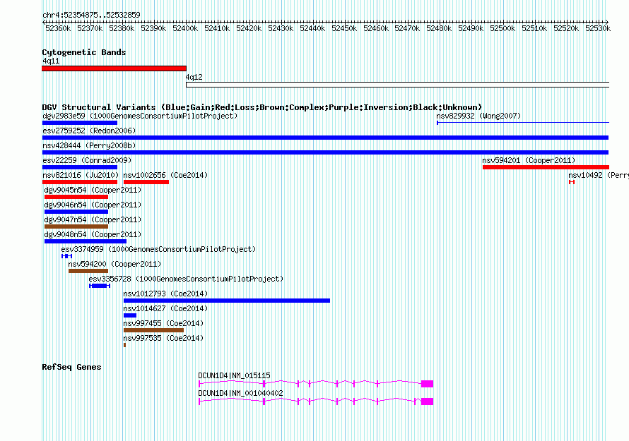 Variant DetailsVariant: nsv428444| Internal ID | 18624894 | | Landmark | | | Location Information | | | Cytoband | 4q11 | | Allele length | | Assembly | Allele length | | hg38 | 177985 | | hg19 | 177985 | | hg18 | 177985 |