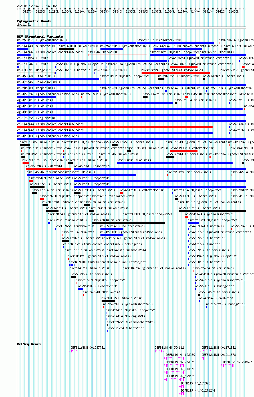 Variant DetailsVariant: nsv4286839 | Internal ID | 20466101 | | Landmark | | | Location Information | | | Cytoband | 20q11.21 | | Allele length | | Assembly | Allele length | | hg38 | 177395 | | hg19 | 177395 |