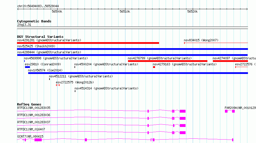 | Variant Type | CNV duplication | Copy Number | | Allele State | | Allele Origin | | Probe Count | | Validation Flag | | Merged Status | M | Merged Variants | | Supporting Variants | nssv15964532 | Samples | | Known Genes | FAM209A, GCNT7, RTFDC1 | Method | Sequencing | Analysis | SV calls were generated using multi-algorithm consensus pipeline involving raw evidence assessment, filtering, clustering, genotyping, alternative allele structure resolution, and gene annotation. These methods are described in detail in the gnomAD-SV preprint [Collins*, Brand*, et al., bioRxiv (2019)|https://www.biorxiv.org/content/10.1101/578674v1], and are largely based on methods developed in [Werling et al., Nat. Genet. (2018)|https://www.ncbi.nlm.nih.gov/pubmed/29700473]. | Platform | | Comments | | Reference | gnomAD_Structural_Variants | Pubmed ID | 12345678 | Accession Number(s) | nsv4288444