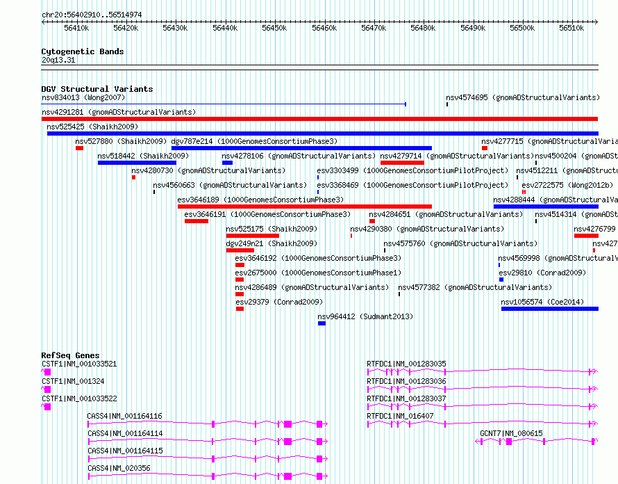 | Variant Type | CNV deletion | Copy Number | | Allele State | | Allele Origin | | Probe Count | | Validation Flag | | Merged Status | M | Merged Variants | | Supporting Variants | nssv15859848 | Samples | | Known Genes | CASS4, CSTF1, GCNT7, RTFDC1 | Method | Sequencing | Analysis | SV calls were generated using multi-algorithm consensus pipeline involving raw evidence assessment, filtering, clustering, genotyping, alternative allele structure resolution, and gene annotation. These methods are described in detail in the gnomAD-SV preprint [Collins*, Brand*, et al., bioRxiv (2019)|https://www.biorxiv.org/content/10.1101/578674v1], and are largely based on methods developed in [Werling et al., Nat. Genet. (2018)|https://www.ncbi.nlm.nih.gov/pubmed/29700473]. | Platform | | Comments | | Reference | gnomAD_Structural_Variants | Pubmed ID | 12345678 | Accession Number(s) | nsv4291281