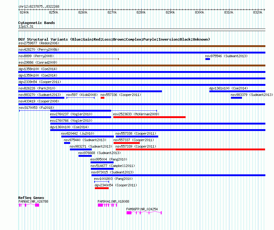 Variant DetailsVariant: nsv433419 | Internal ID | 15378687 | | Landmark | | | Location Information | | | Cytoband | 12p13.31 | | Allele length | | Assembly | Allele length | | hg38 | 84394 | | hg19 | 84394 | | hg18 | 84394 | | hg17 | 84394 |