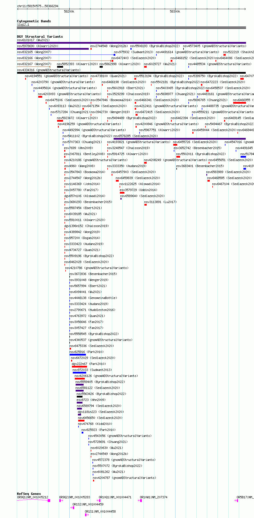 Variant DetailsVariant: nsv4334316 | Internal ID | 20186109 | | Landmark | | | Location Information | | | Cytoband | 11q12.1 | | Allele length | | Assembly | Allele length | | hg38 | 215720 | | hg19 | 215721 |
