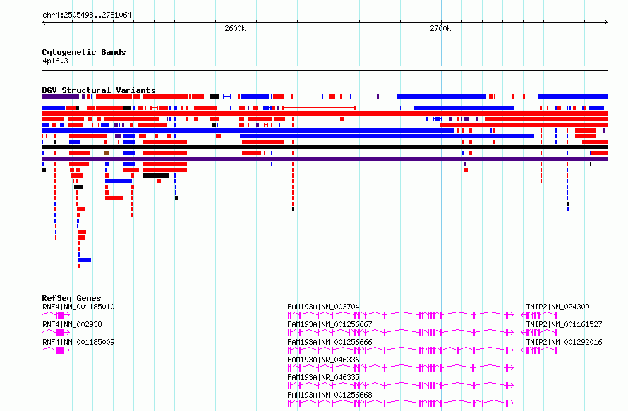 Variant DetailsVariant: nsv4337993 | Internal ID | 20186796 | | Landmark | | | Location Information | | | Cytoband | 4p16.3 | | Allele length | | Assembly | Allele length | | hg38 | 275567 | | hg19 | 275567 |