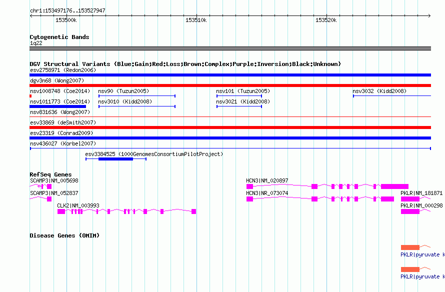 Variant DetailsVariant: nsv436027 | Internal ID | 15380514 | | Landmark | | | Location Information | | | Cytoband | 1q22 | | Allele length | | Assembly | Allele length | | hg38 | 30772 | | hg19 | 30772 | | hg18 | 30772 |