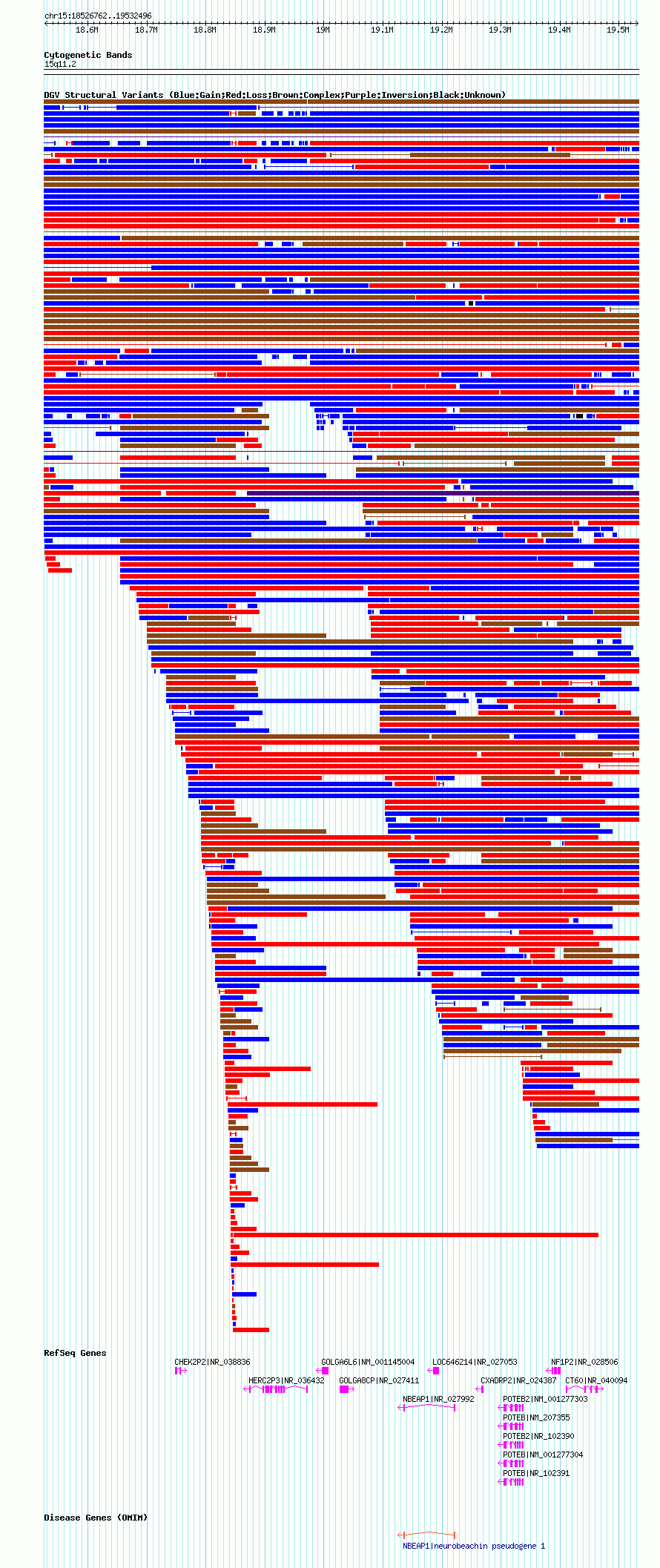 Variant DetailsVariant: nsv436057 | Internal ID | 15380544 | | Landmark | | | Location Information | | | Cytoband | 15q11.1 | | Allele length | | Assembly | Allele length | | hg38 | 1001014 | | hg19 | 1001090 | | hg18 | 1005735 |