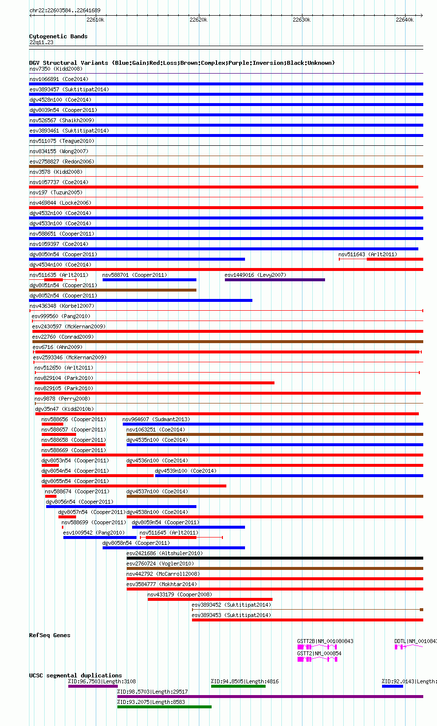 Variant DetailsVariant: nsv436348 | Internal ID | 15034148 | | Landmark | | | Location Information | | | Cytoband | 22q11.23 | | Allele length | | Assembly | Allele length | | hg38 | 38104 | | hg19 | 38106 | | hg18 | 38106 |