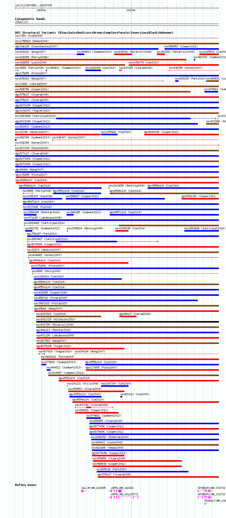 Variant DetailsVariant: nsv436354 | Internal ID | 15380840 | | Landmark | | | Location Information | | | Cytoband | 22q11.23 | | Allele length | | Assembly | Allele length | | hg38 | 226414 | | hg19 | 226414 | | hg18 | 226414 |