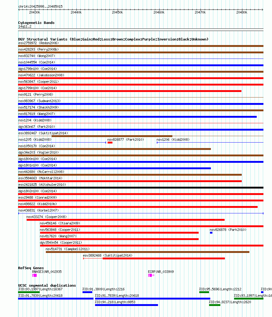 Variant DetailsVariant: nsv436831 Internal ID | 15034628 | Landmark | | Location Information | | Cytoband | 14q11.2 | Allele length | Assembly | Allele length | hg38 | 59018 | hg19 | 59018 | hg18 | 59018 |