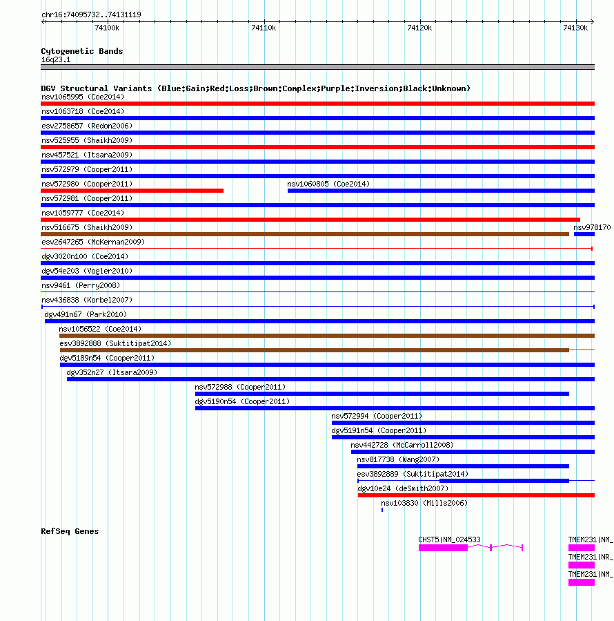 Variant DetailsVariant: nsv436838 | Internal ID | 15034635 | | Landmark | | | Location Information | | | Cytoband | 16q23.1 | | Allele length | | Assembly | Allele length | | hg38 | 35388 | | hg19 | 35388 | | hg18 | 35388 |